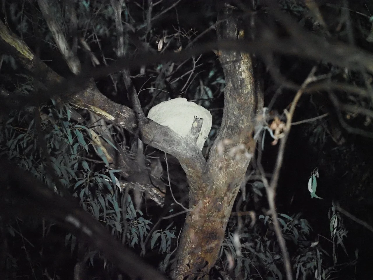 During a recent Nocturnal Neighbours spotlight walk, our group spotted something special—an impressively built mud nest perched high in a eucalypt.